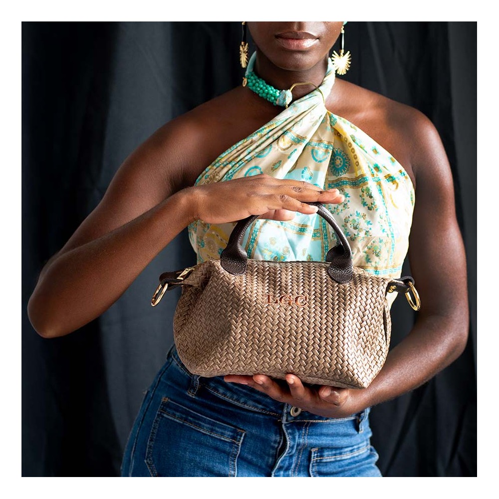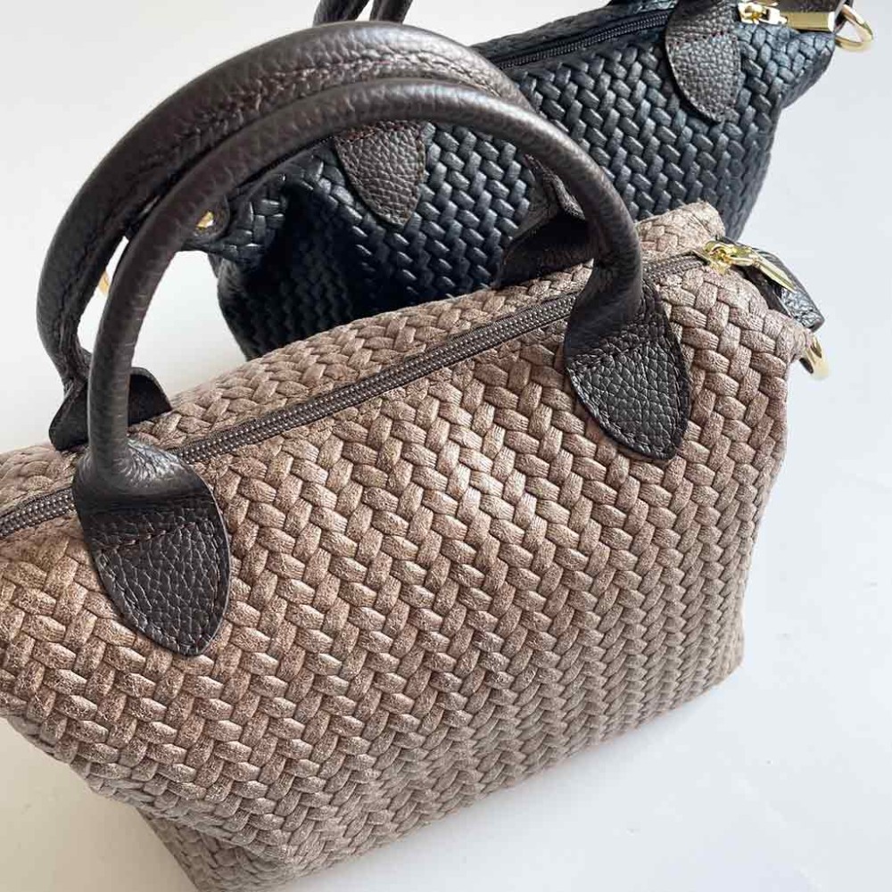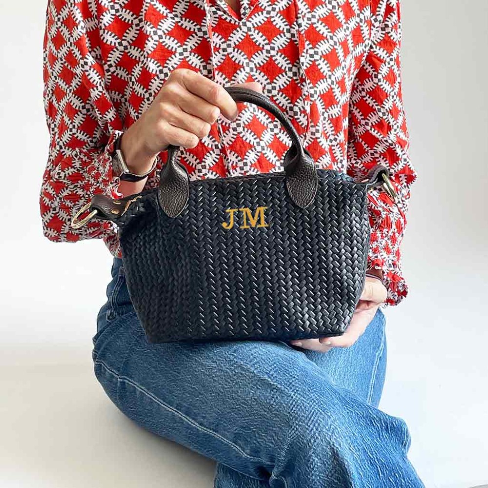 Bolso de piel trenzado para mujer en color marrón o negro para bordar con las iniciales que quieras. Tiene un tamaño ideal para llevar como bandolera, con cremallera y bolsito interior. Puedes elegir el color del bordado de las iniciales. Viene con una correa larga.