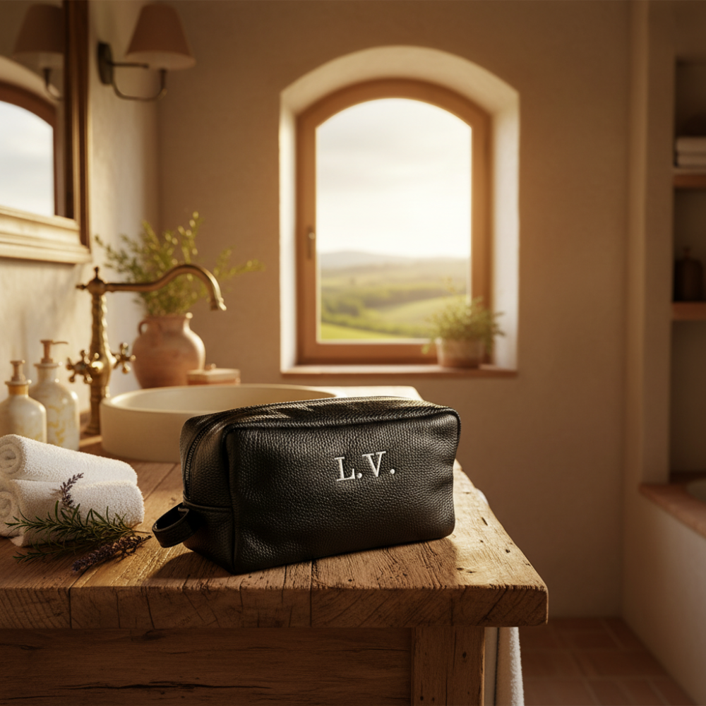 Neceser personalizado de piel para hombres en color negro. Se borda con las iniciales que quieras y en el color que quieras
