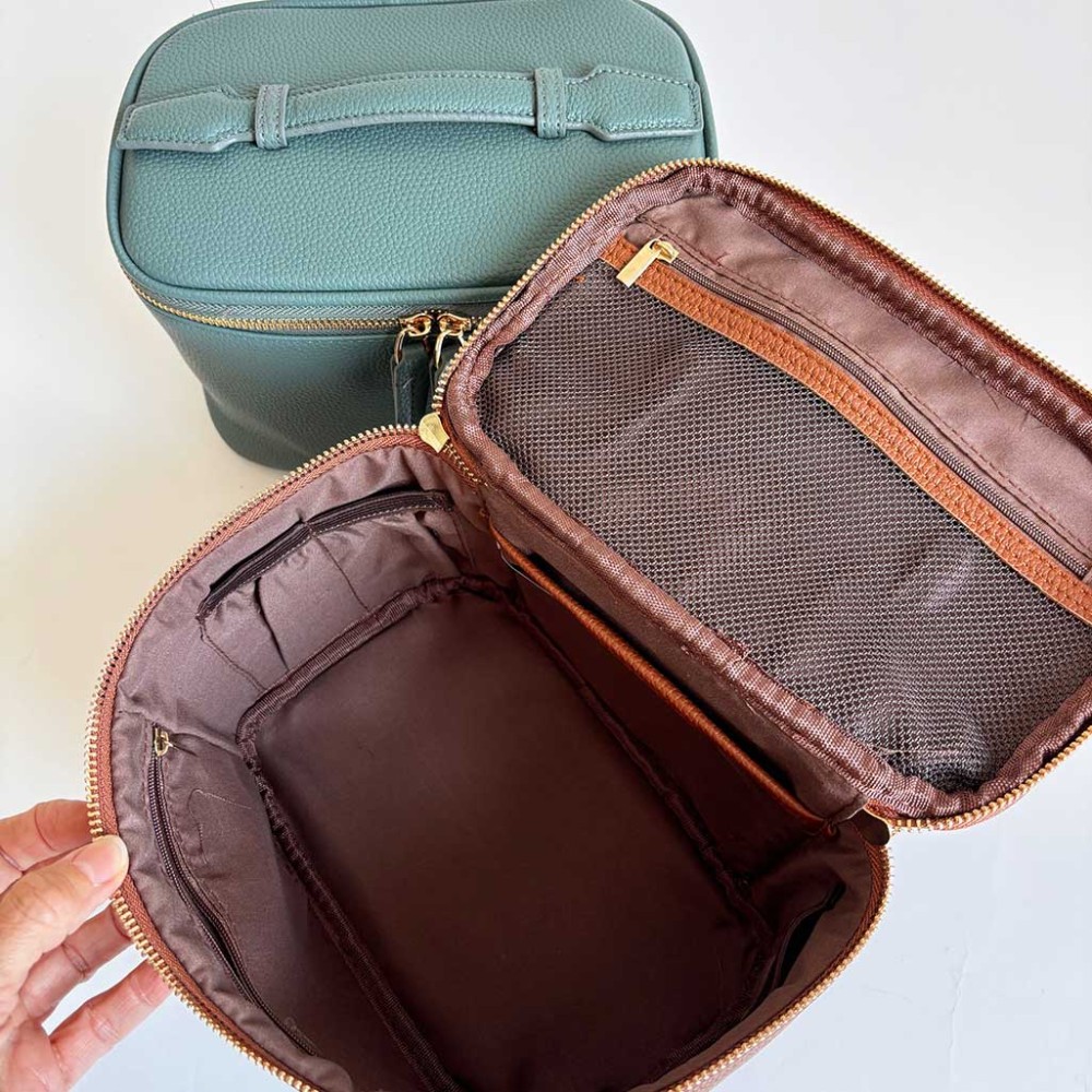 Neceser de piel de vacuno en dos colores para mujer. Bolsa de maquillaje o joyero. Compartimentos y bolsillos con cremallera en el interior.
