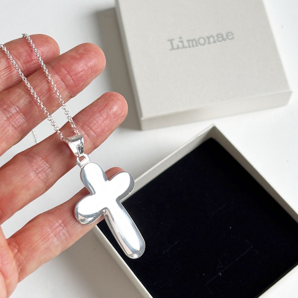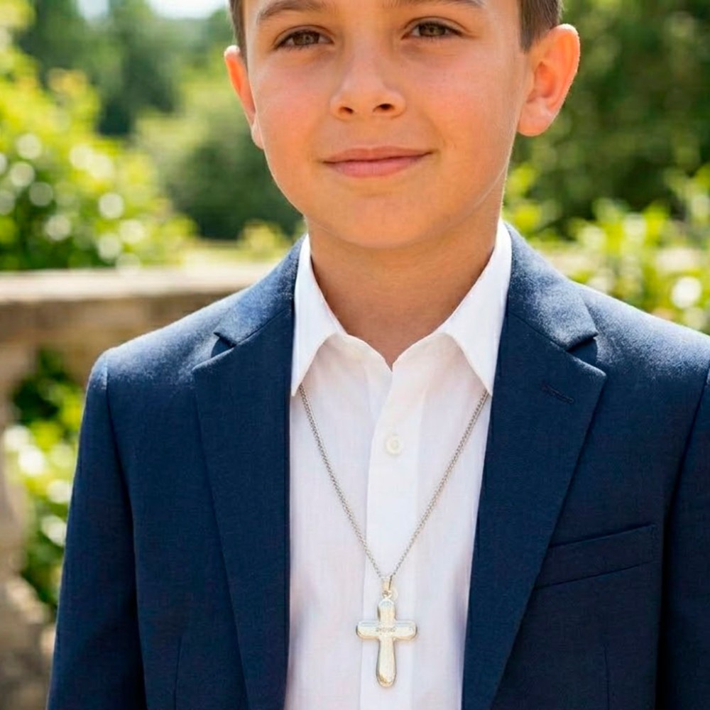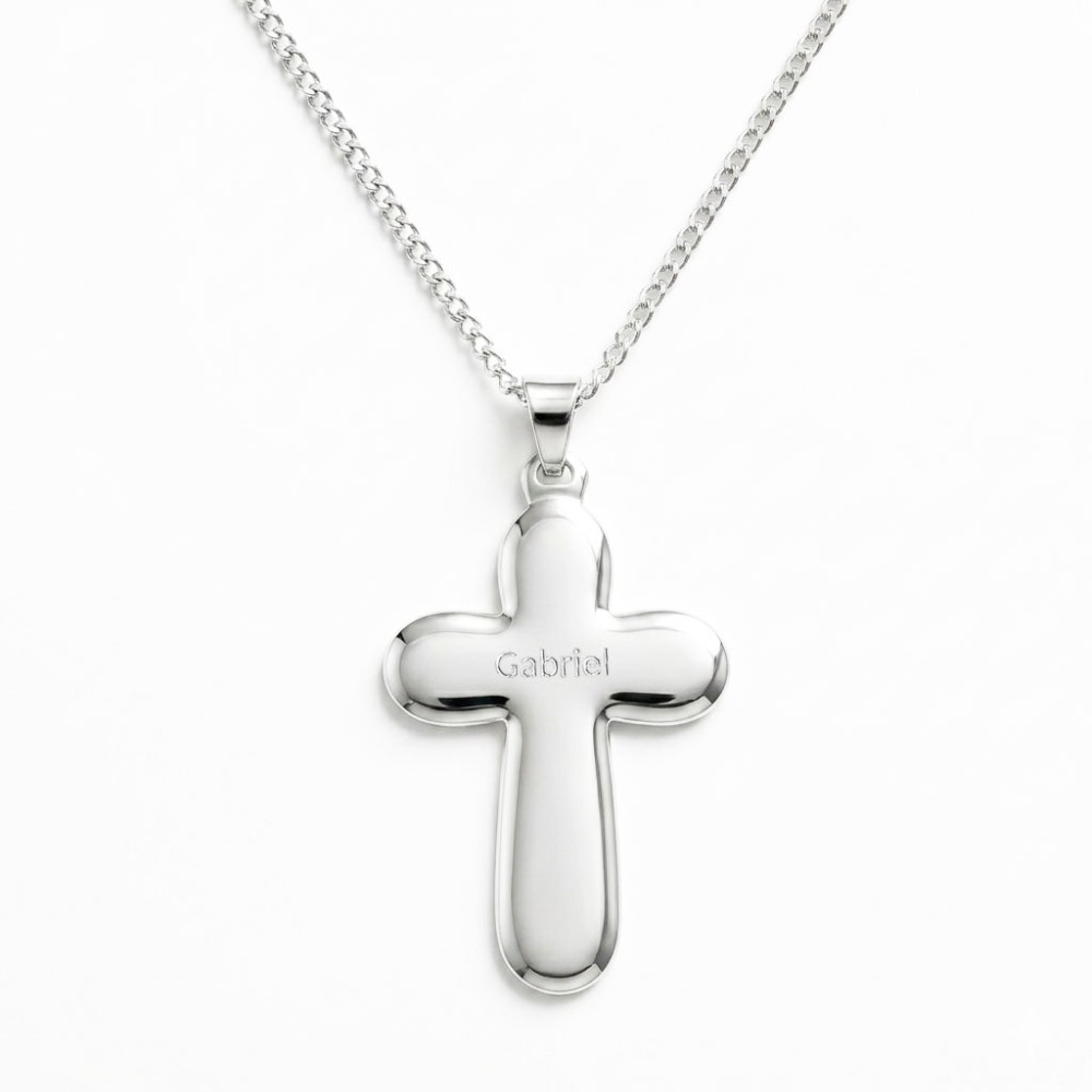 Cruz de plata grande para llevar el día de la Primera Comunión, grabada con el nombre del niño o la niña.