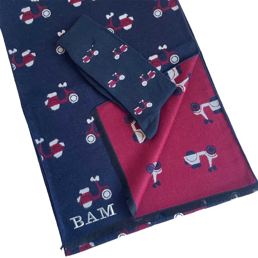 Bufanda reversible alargada para hombre suave en azul marino y roja, donde podemos bordar las iniciales que quieras. Ideal para regalar a chicos jóvenes.